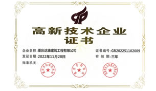 喜訊,重慶達康建筑工程有限公司順利通過重慶市科學技術局、重慶市財政局、國家稅務總局重慶市稅務局等部門的聯合評審驗收,被正式認定為“高新技術企業”,榮獲《高新技術企業證書》。